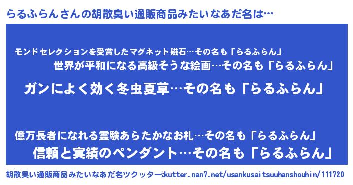 | 意味不明あだ名 | 『自称らるふらん』『ペロリンらるふらん』 |