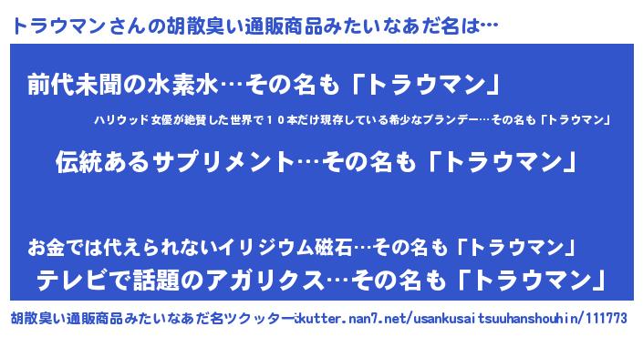 | 欧米人風あだ名 | 『ウサイントラウマン』 |