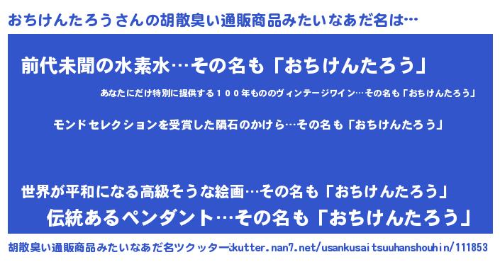 | 男性向けラノベタイトル風あだ名 | 『おちけんたろう~年齢イコール彼女いない歴の魔法使い~』 |