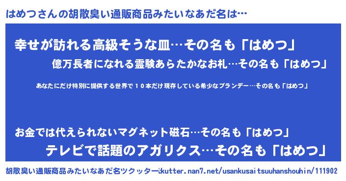 | 意味不明あだ名 | 『住所不定無職はめつ(95歳)』『自称はめつ』 |