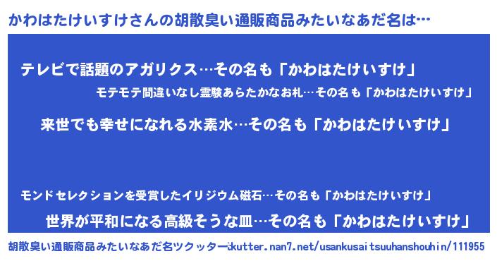 | 男性向けラノベタイトル風あだ名 | 『かわはたけいすけという概念が存在しない退屈な世界 』 |