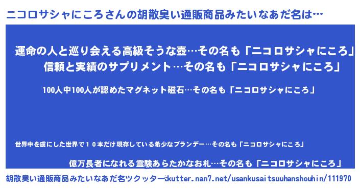 | 男性向けラノベタイトル風あだ名 | 『ニコロサシャニコロスレイヤー』 |