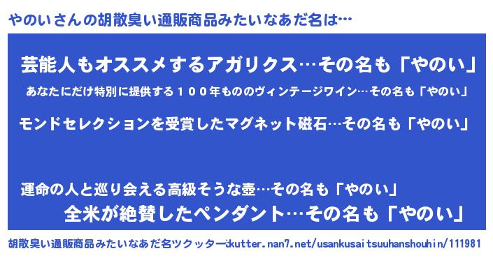 | 男性向けラノベタイトル風あだ名 | 『やのい~年齢イコール彼女いない歴の魔法使い~』 |