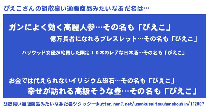 | 意味不明あだ名 | 『住所不定無職ぴえこ(14歳)』『自称ぴえこ』 |