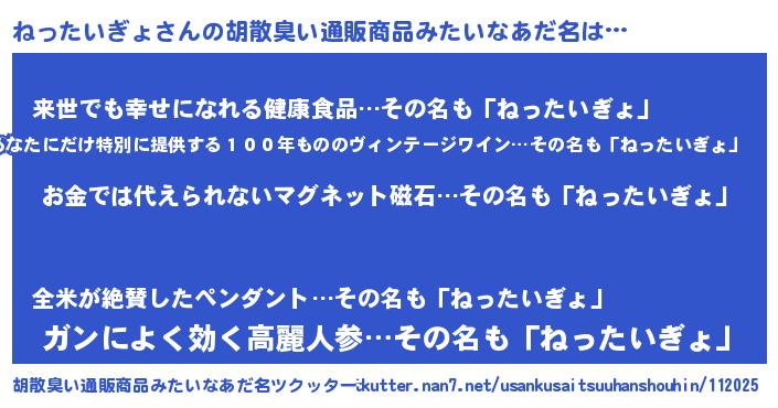 | 男性向けラノベタイトル風あだ名 | 『おまえをオタクにしてやるから、俺をねったいぎょにしてくれ! 』 |
