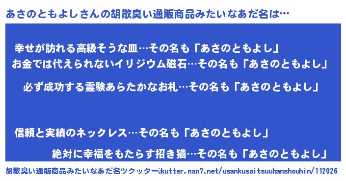 | 男性向けラノベタイトル風あだ名 | 『あさのともよしの憂鬱』 |