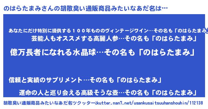 | 恥ずかしいあだ名 | 『プリティーのはらたまみ』『のはっちょ』 |
