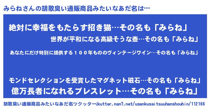 | ヘコむあだ名 | 『みらね(小並感)』『みらにー』 |
