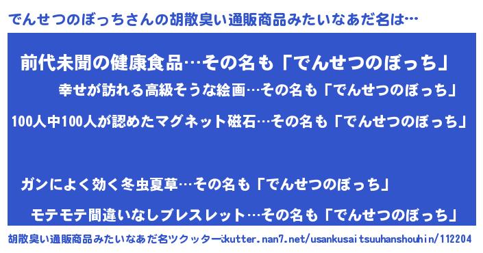 | ヘコむあだ名 | 『でんせつのぼっち(笑)』『でんにゅー』 |