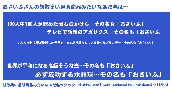 | 意味不明あだ名 | 『住所不定無職おさいふ(86歳)』 |