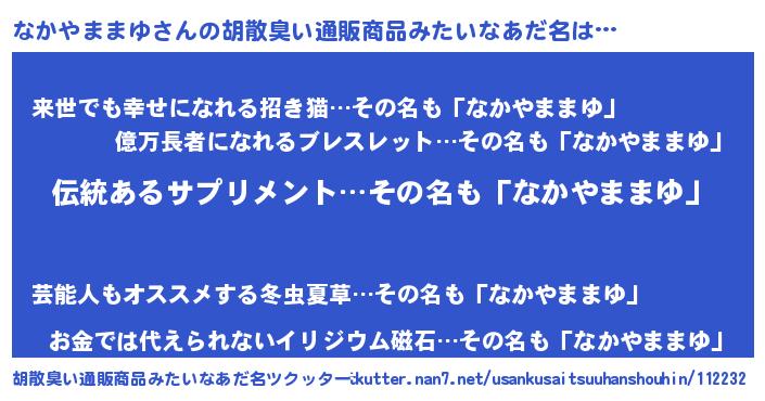 | 男性向けラノベタイトル風あだ名 | 『なかやままゆの嫁は女の子じゃないと思った?』 |