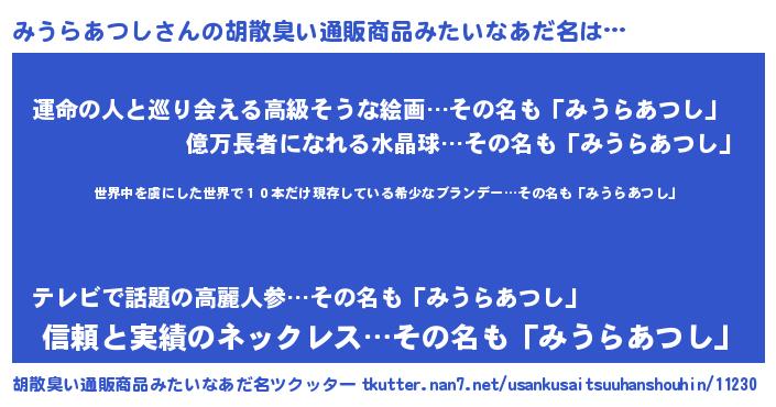 | 男性向けラノベタイトル風あだ名 | 『みうらあつしに滅ぼされるだけの簡単なお仕事です』 |