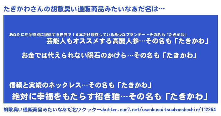 男性向けラノベタイトル風あだ名 | 『転生したらたきかわだった件』 |