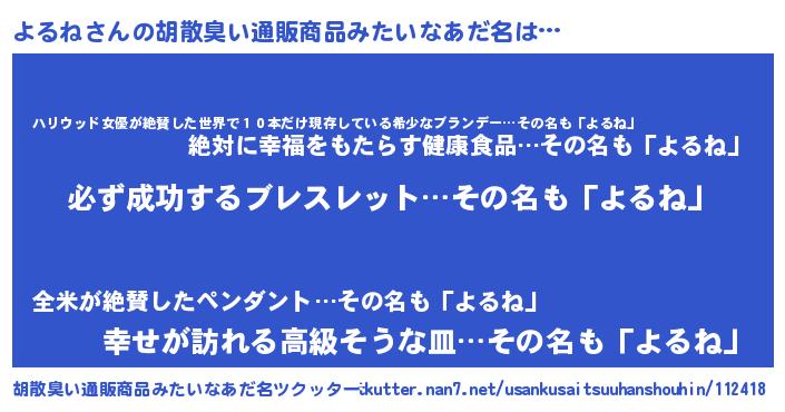 | 男性向けラノベタイトル風あだ名 | 『よるねの憂鬱』『はたらくよるねさま!』 |