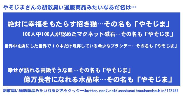 | 男性向けラノベタイトル風あだ名 | 『この素晴らしい世界にやそじまを!』 |