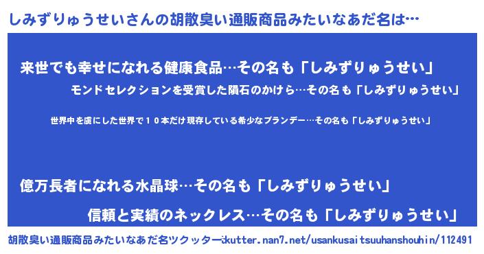 | 意味不明あだ名 | 『住所不定無職しみずりゅうせい(81歳)』 |