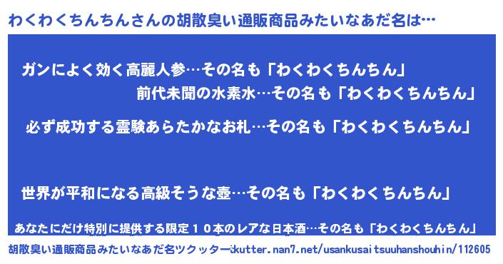 | 男性向けラノベタイトル風あだ名 | 『わくわくちんちんの憂鬱』 |