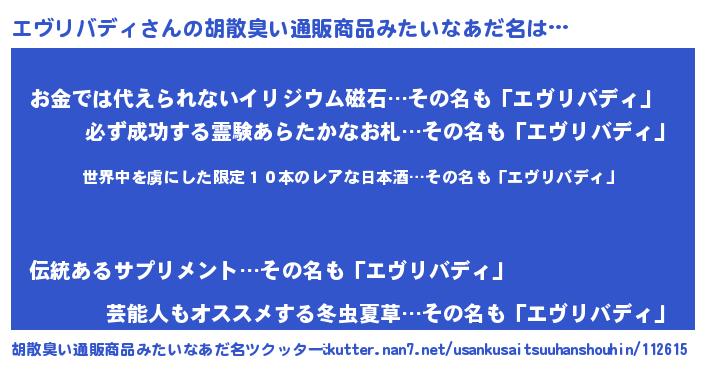 | 意味不明あだ名 | 『住所不定無職エヴリバディ(50歳)』 |