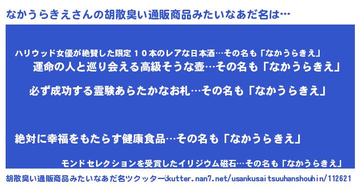 | 男性向けラノベタイトル風あだ名 | 『なかうらきえの憂鬱』 |