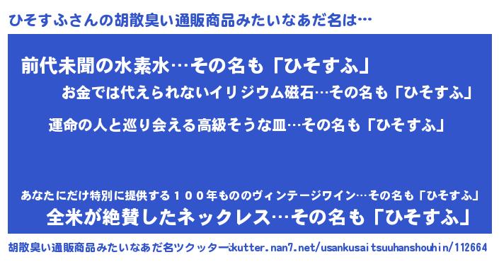 | 男性向けラノベタイトル風あだ名 | 『ひそすふ~年齢イコール彼女いない歴の魔法使い~』 |