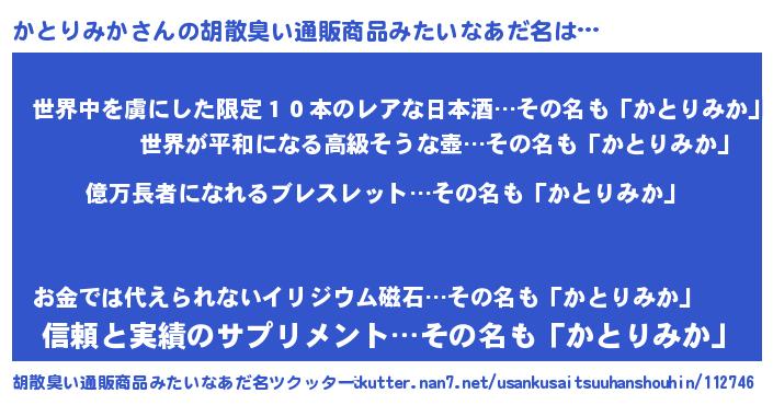 | 男性向けラノベタイトル風あだ名 | 『かとりみか~年齢イコール彼女いない歴の魔法使い~』 |