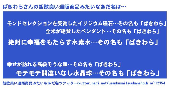 | 男性向けラノベタイトル風あだ名 | 『ばきわらという概念が存在しない退屈な世界 』 |
