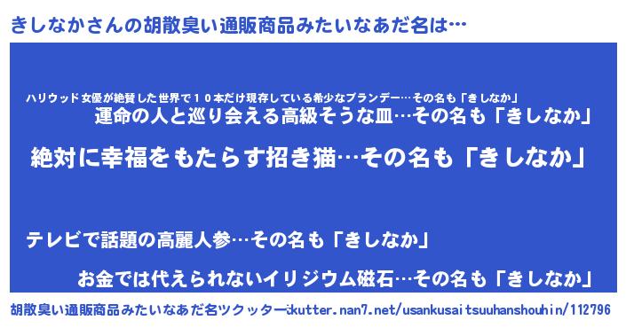 | 男性向けラノベタイトル風あだ名 | 『きしなかという概念が存在しない退屈な世界 』 |