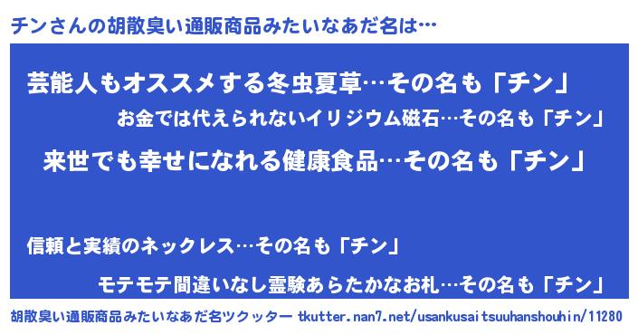 | 男性向けラノベタイトル風あだ名 | 『転生したらチンだった件』『チンの憂鬱』 |