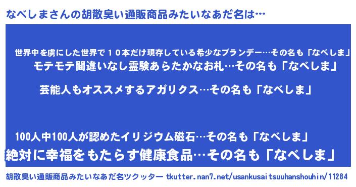 | 意味不明あだ名 | 『自称なべしま』『永久保存なべしま』 |