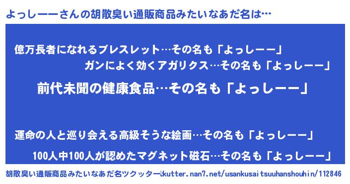 | 男性向けラノベタイトル風あだ名 | 『よっしーー~年齢イコール彼女いない歴の魔法使い~』 |