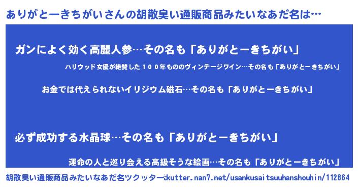 | ヒーロー風カッコイイあだ名 | 『慈愛の使者ありがとーきちがい』 |