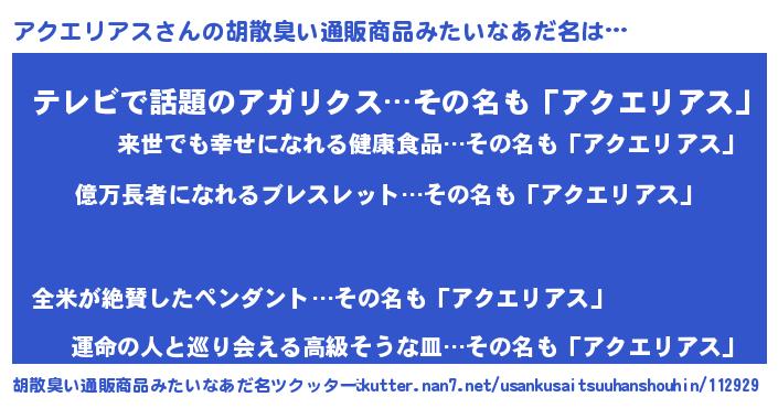 | ヒーロー風カッコイイあだ名 | 『スーパーアクエリアス』『天弓騎士アク』 |