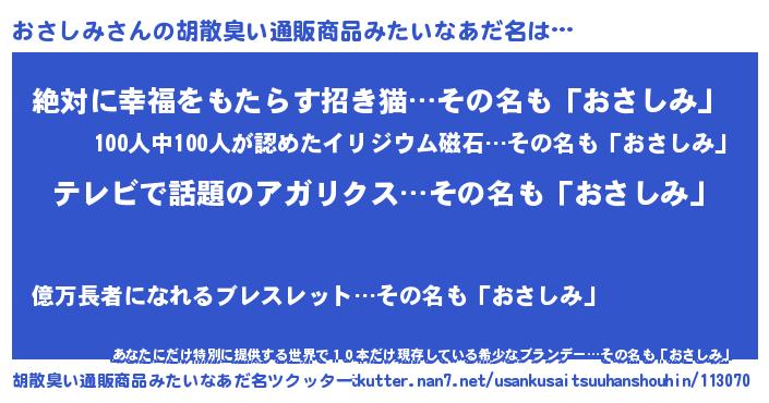 | 意味不明あだ名 | 『なめこ科おさしみ属』『自称おさしみ』 |
