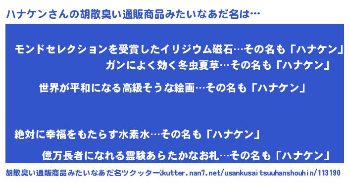 | 男性向けラノベタイトル風あだ名 | 『やはりハナケンの青春ラブコメはまちがっている 』 |