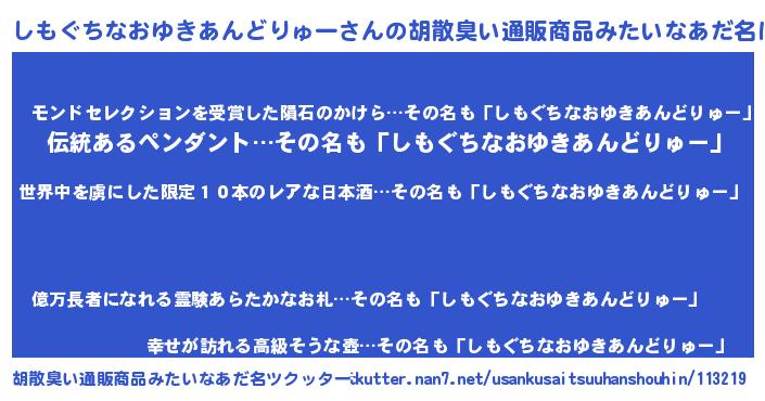 | 意味不明あだ名 | 『住所不定無職しもぐちなおゆきあんどりゅー(50歳)』 |