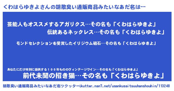 | 伝説のあだ名 | 『救世主となる占い師くわはらゆきよ』 |