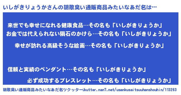 | 男性向けラノベタイトル風あだ名 | 『イシガキリョウカスレイヤー』 |