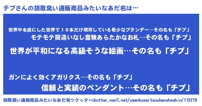 | ヘコむあだ名 | 『なまこ酢』『チプっぺ』『チプもー』 |