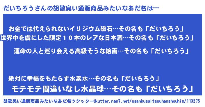 | 男性向けラノベタイトル風あだ名 | 『だいちろう~年齢イコール彼女いない歴の魔法使い~』 |