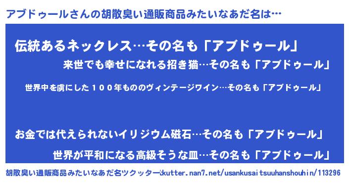 | 意味不明あだ名 | 『住所不定無職アブドゥール(12歳)』 |