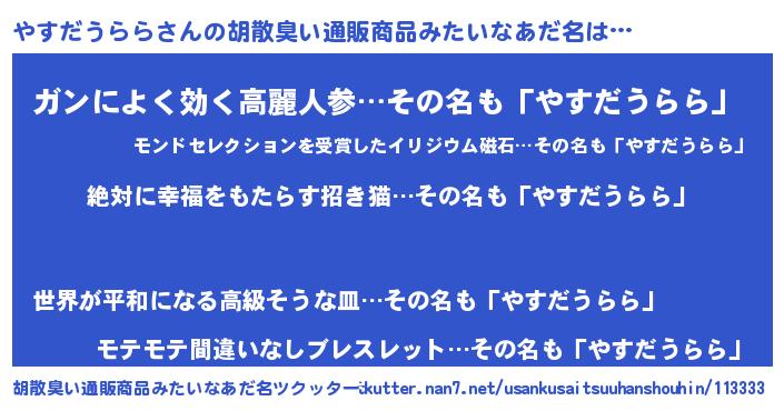 | ヘコむあだ名 | 『やすだうらら(小並感)』『やすふぇ~』 |