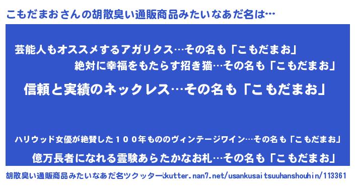 | 男性向けラノベタイトル風あだ名 | 『ダンジョンにこもだまおを求めるのは間違っているだろうか』 |