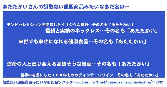 | ヒーロー風カッコイイあだ名 | 『ネオアタタカイ』『仮面アタダー』 |