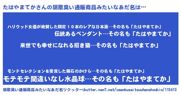 | 男性向けラノベタイトル風あだ名 | 『たはやまてかという概念が存在しない退屈な世界 』 |
