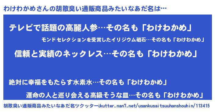 | 意味不明あだ名 | 『とにかく怪しいわけわかめ』 |