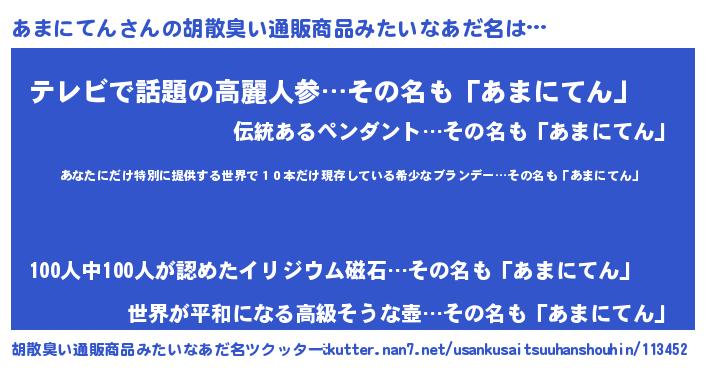| 男性向けラノベタイトル風あだ名 | 『あまにてん~年齢イコール彼女いない歴の魔法使い~』 |
