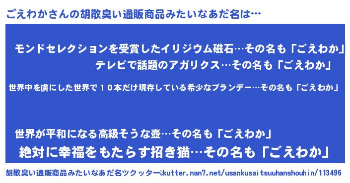 | 男性向けラノベタイトル風あだ名 | 『ごえわかに滅ぼされるだけの簡単なお仕事です』 |