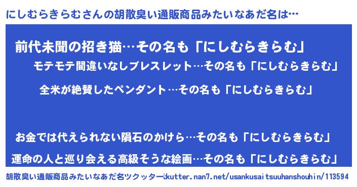 | 男性向けラノベタイトル風あだ名 | 『にしむらきらむの嫁は女の子じゃないと思った?』 |