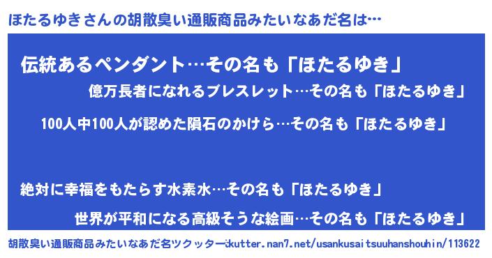 | 男性向けラノベタイトル風あだ名 | 『おまえをオタクにしてやるから、俺をほたるゆきにしてくれ! 』 |