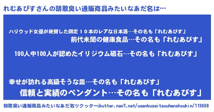 | 男性向けラノベタイトル風あだ名 | 『おまえをオタクにしてやるから、俺をれむあびすにしてくれ! 』 |